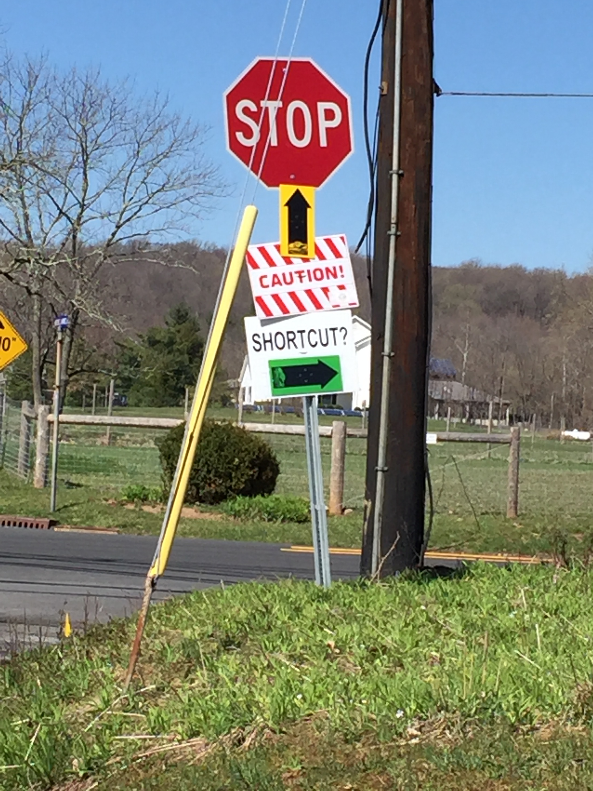 The tantilizing sign that indicates it could all end easily by using the shortcut instead of Hopewell Amwell Road's Climb. We still attacked the climb.