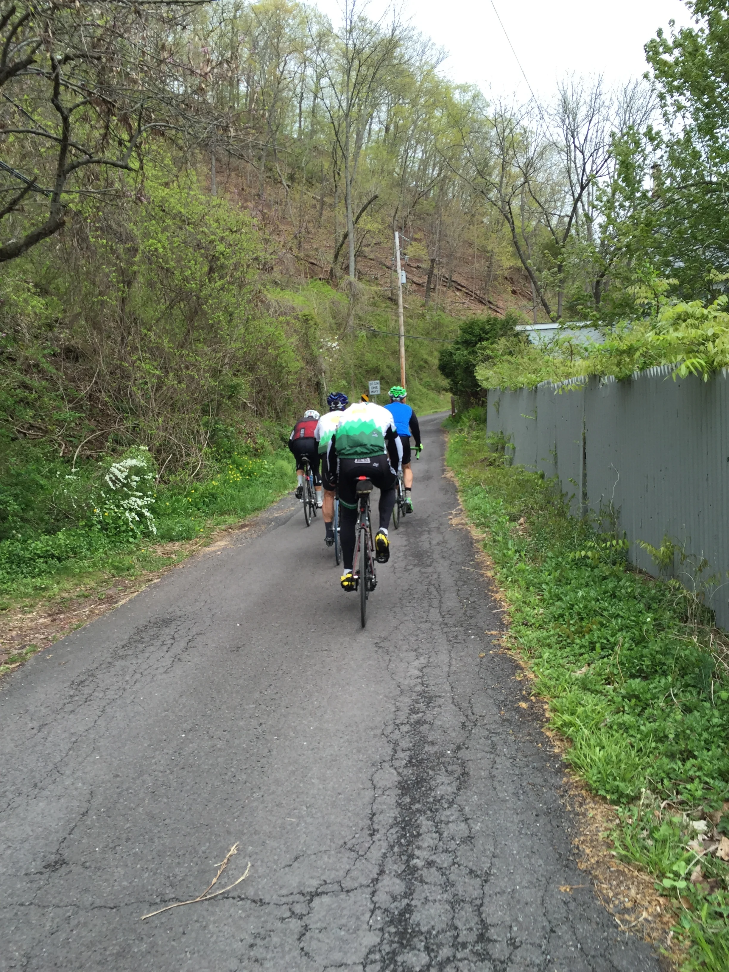 There we were buzzing down Milford Warren Glen Road. I love flying down this newly resurfaced and slightly downhill road. Yet today there was no power. I was beginning to wonder if I left enough effort in the legs for the final four climbs. We passed through the river town of Milford, NJ. Josh led the way. He took his hands off the bar to point left, which I mistook for asking to pull through. I didn't comprehend we were going back up already. The next climb came that unexpectedly. Back up we went. The conversations came to a halt for this slice of the event. I think deals were being made internally.