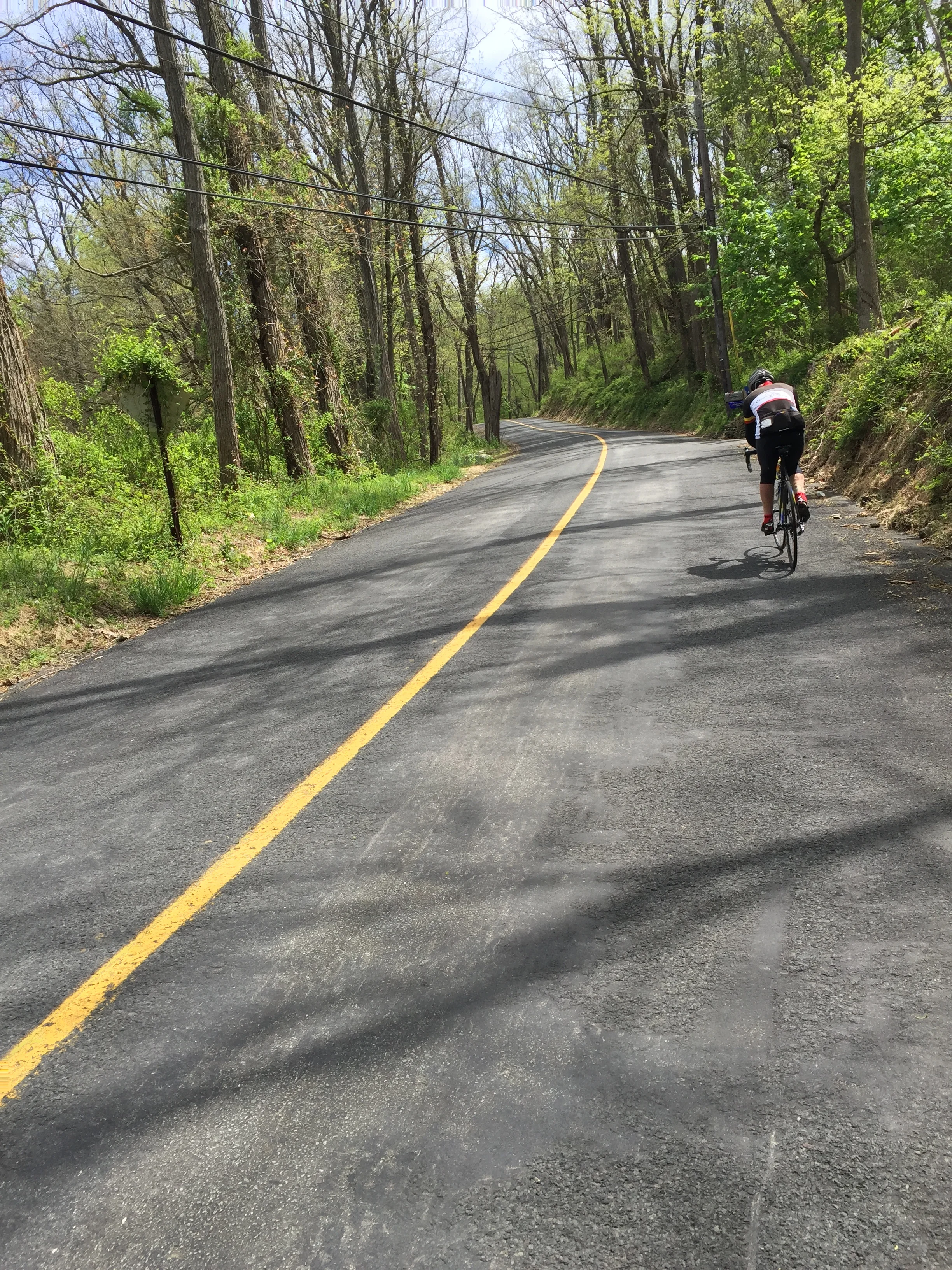The thin black line of Uhlerstown's initial climb. The surprise lay in waiting behind the next turn (and the slight turn after that). It is physically impossible to photograph the steepest part while riding, hence there are no photos of said steep portion.