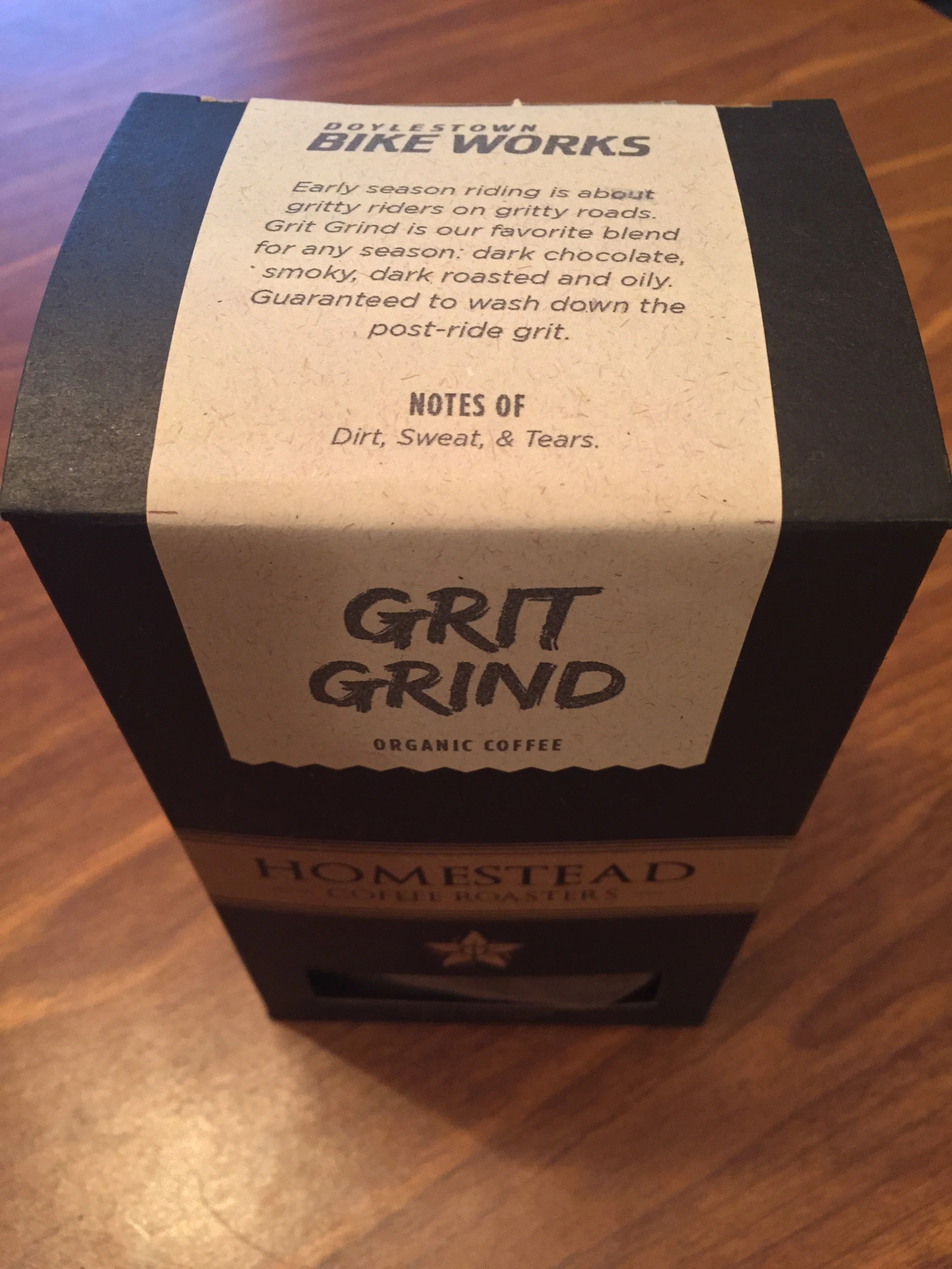Smartly two wonderful Bucks County companies have come together for the holiday season to produce coffee beans for dark winter days. Winter is a season for darkness. American craft stout brews are big and dark during winter. Coffee beans follow suit with darkness to help carry us through dark morning commutes and equally dark returns. Homestead Coffee’s Grit Grind dark roast is as dark as they come from the amazing roasters out of Upper Black Eddy, Pennsylvania. It is roasted in a collaboration with Doylestown Bike Works.