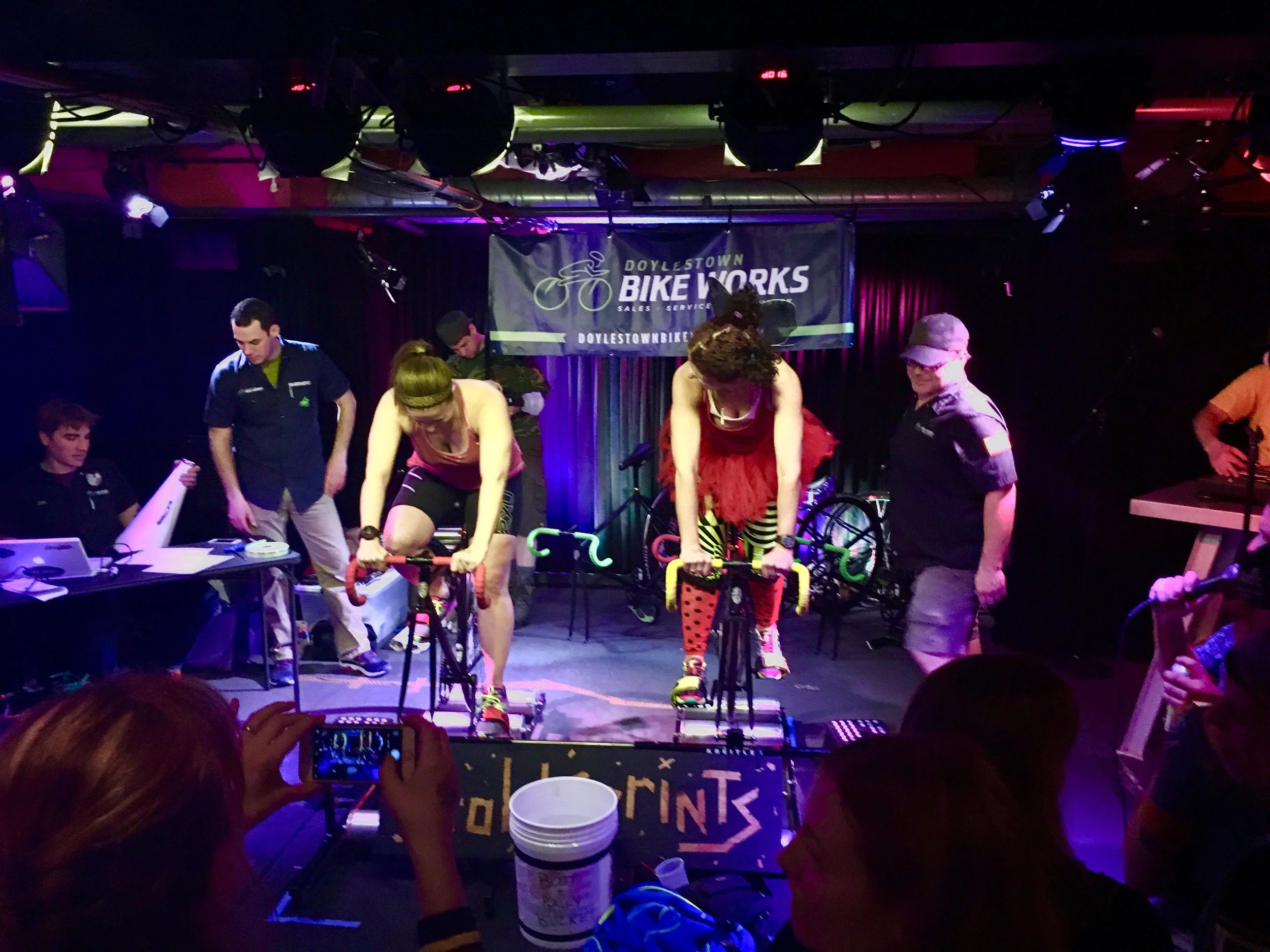 Entering to the lower level of Puck in Doylestown brought back a similar feeling I might have had 10 or 15 years ago, attending a show in the basement of someone's house to listen to friends jam and test the volume knob on their 30 watt Peavey combo amp. Sunday provided a similar feeling but this time the watts were being turned by the legs of professional cyclists, weekend warriors, 9- to- 5ers, Olympians, superheroes, hometown heroes, and yes, a Ninja Turtle. As I alluded to earlier, it's a scene you must see for yourself.