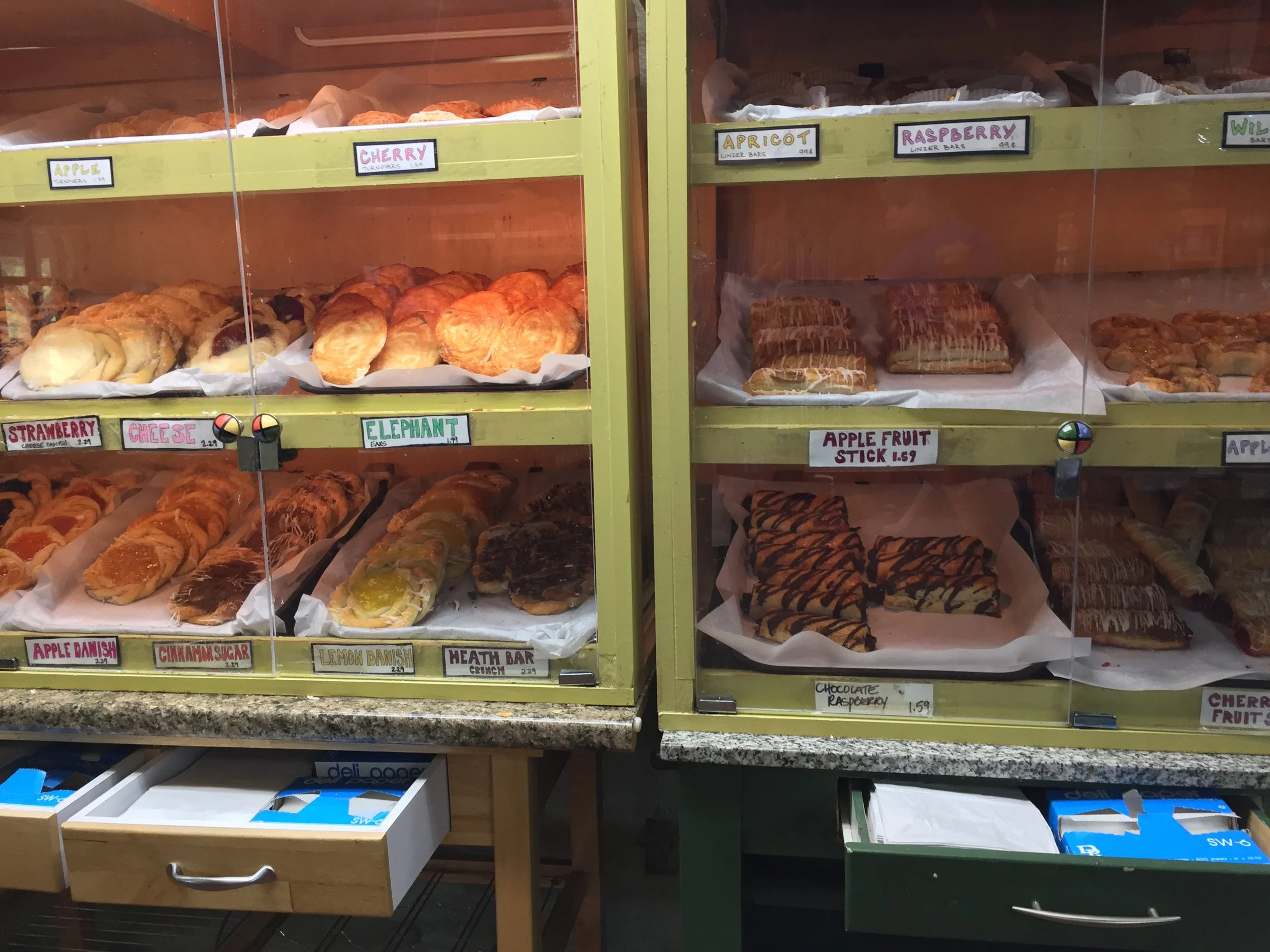 Along the side wall, one can get a sugar jolt from the cabinet of Danish or stuffed croissants.