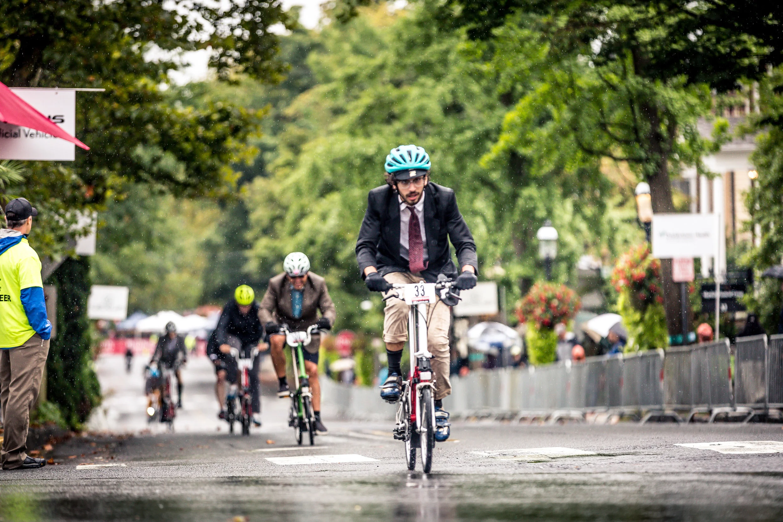 That’s where we picked up the race on Sunday, between the women and men’s pro criterium race. Before we get too far ahead of ourselves, there are a couple odd rules to Brompton racing. For starters, only Bromptons may partake in the Brompton Burst. The event has a borrowed start from the old days of motorsports. Called the Le Mans start, riders start across the street from their folded bikes. On the command the riders cross the street and unfold their bikes. They then navigate a small course for several laps. The full event must be completed in work attire. That is, expect to see men whipping around in tweed – and one donning a bolo tie - and women sporting wool sweaters. The winner is the Brompton champion who may or may not continue on to work after crossing the line.