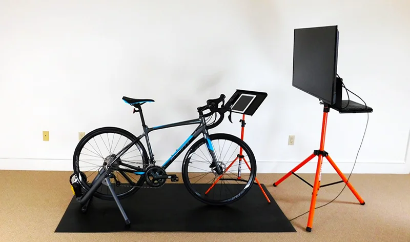 Chapstand, an inclusive virtual reality cycling kit, brings a full line-up of material to the indoor rider. As stated above, Chapstand’s biggest item is the heavy-duty television stand that holds between a 28- and 55-inch screens. After experiencing Zwift on a big screen television, all feelings of claustrophobic screen information have vanished. There is more space for the rider and surrounding screen on a large format television as compared to a tablet. Also reduced is the necessity to squint to see the watts-per-kilogram or beats per minute.