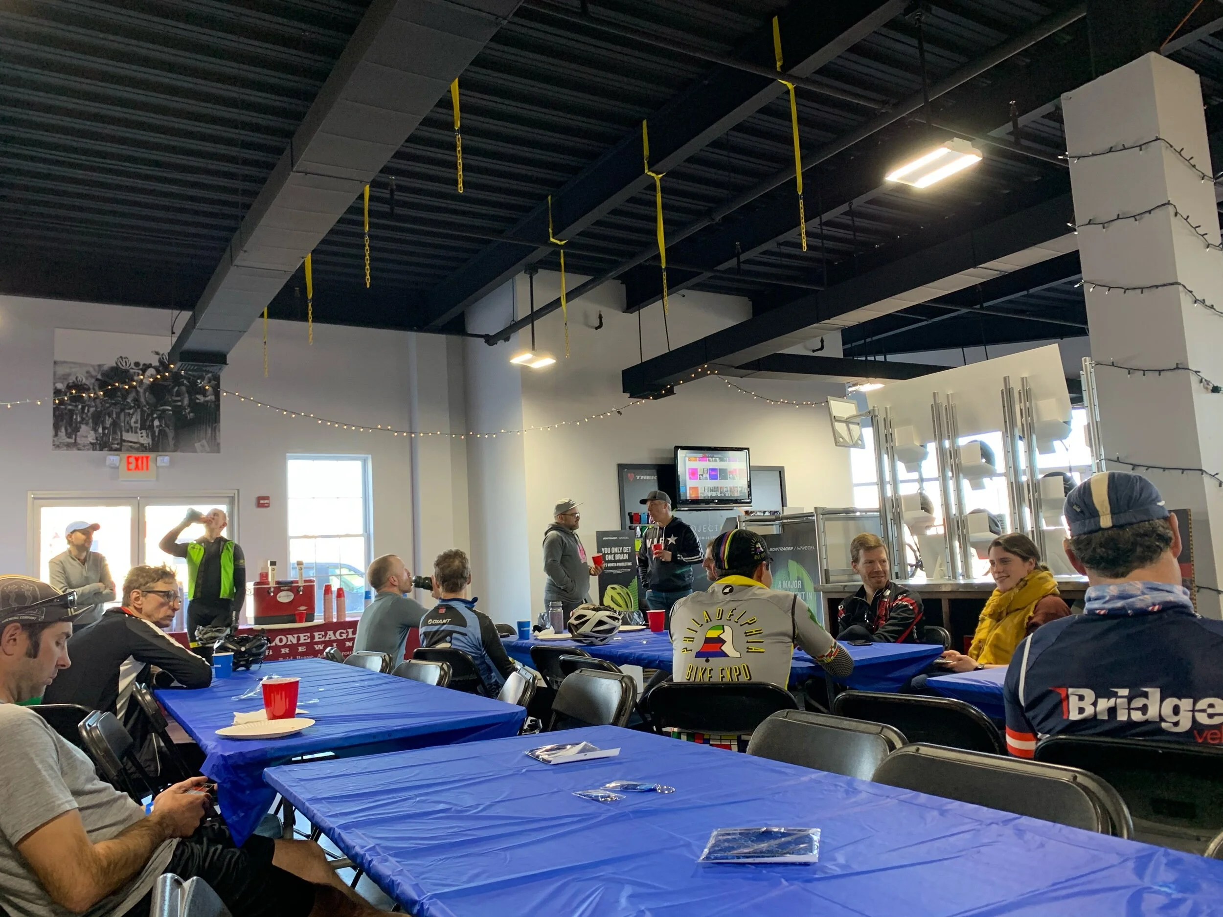 V5 hosted the finish party in fine style. Here some early finishers enjoyed post-ride pizza and libations provided by Lone Eagle Brewing.
