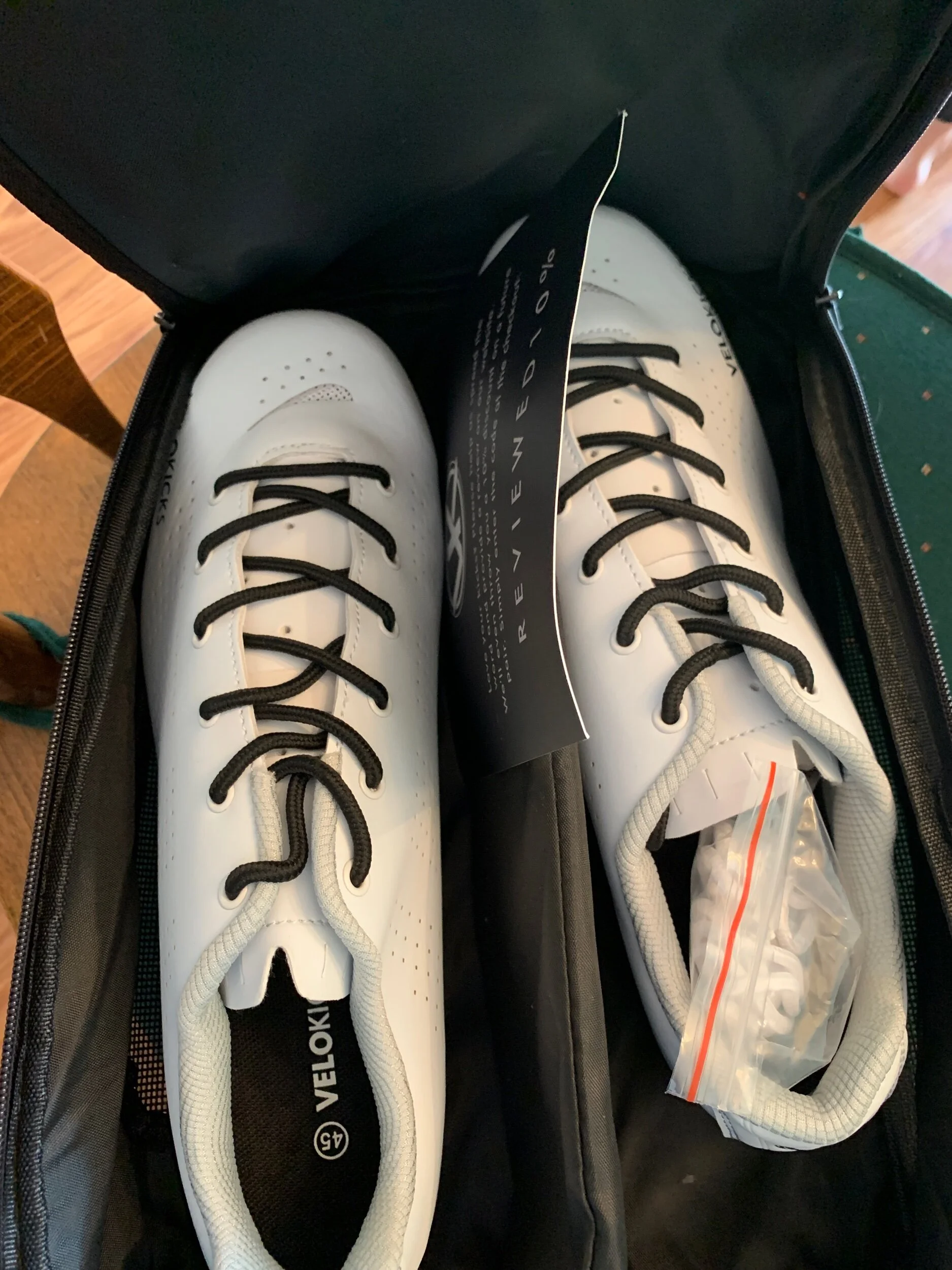 The VeloKicks shipment included a boot bag, shoes, and two laces.