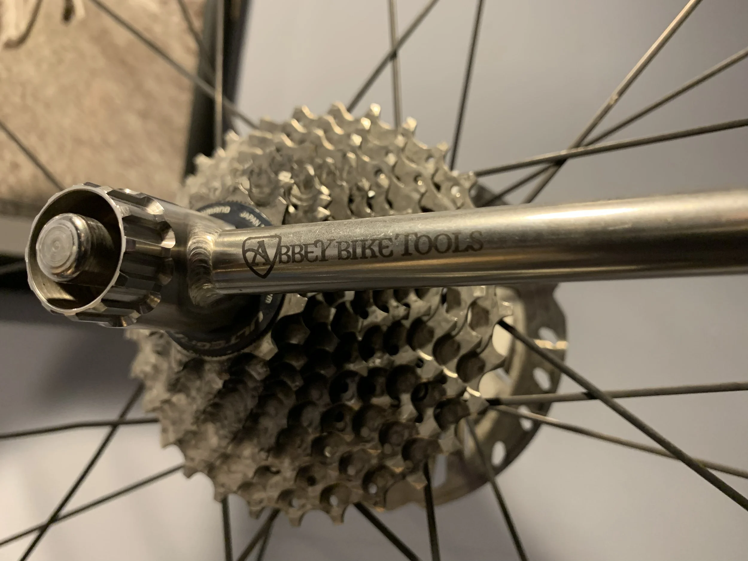 After regular swapping of cassettes on trainers and wheels a simpler system had to be devised. Instead of having three tools to maintain cassettes, Bend, OR, cycling tool creator Abbey Bike Tools replaced two of them with the Crombie Thru Axle Dual Sided Tool. Since we are not planning to use them from the back of a team car during a Grand Tour, we overlooked the Super Light and went with the Standard. One thing is certain, Abbey Bike Tools designers keep asking the question, “How can it be made easier?”