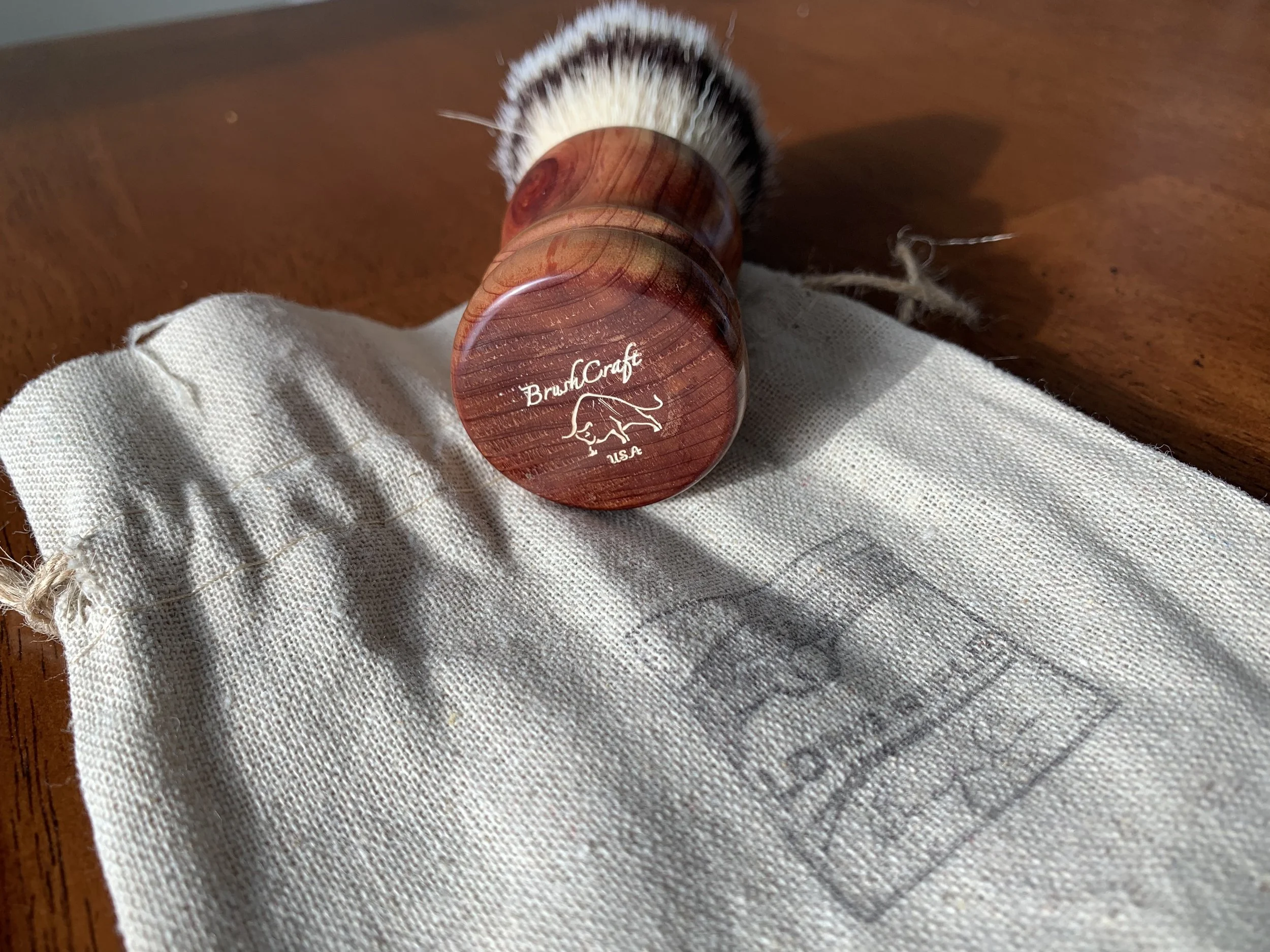 Chris Trimble has been making shave brushes for a while on his Etsy platform. Recently, Long Rifle Soap Company, one of our favorite shave soap makers, commissioned several pieces. We happened to snatch up the cedar handle with a faux tuxedo brush. Its short stature and light weight made it immediately comfortable to hold through the various tasks. With the brush resting on the side of the scuttle, the BrushCraft logo looks back. Per BrushCraft’s social media, a laser etching machine made the logo possible.