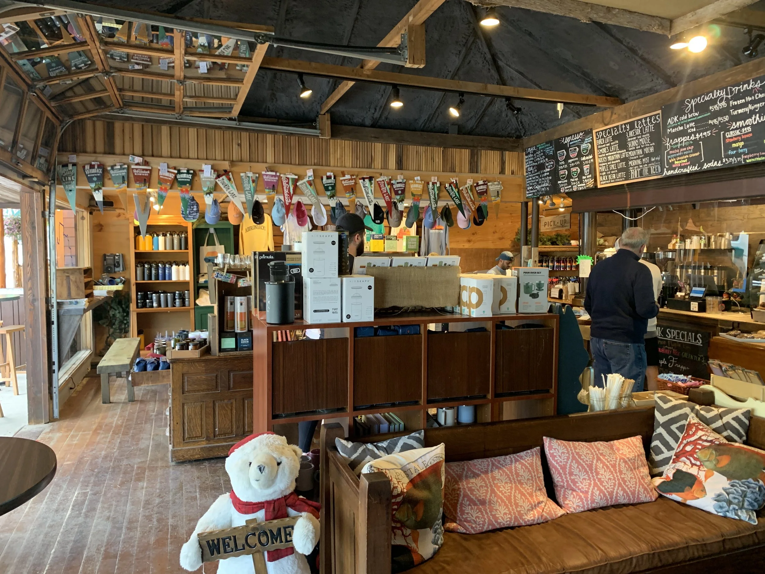 Blue Line Coffee House sells coffee and Adirondack goods with a rustic appeal in Inlet, NY.