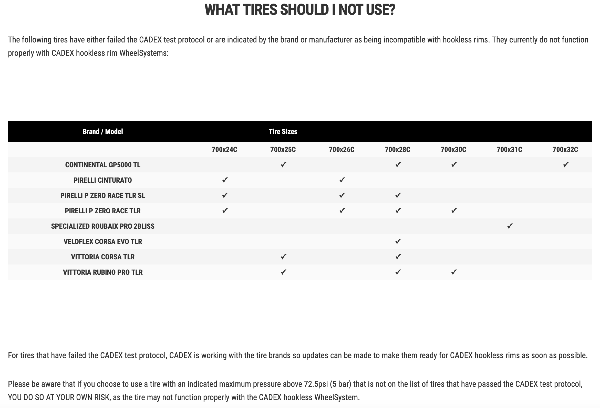 A second table produced by CADEX is blatant in its message- that the tires either failed the protocol or the manufacturer specifically forbids its use on hookless rims. These are some of the more well-known casings; tires such as Specialized Roubaix, Veloflex Corsa, Vittoria Corsa, and Continental GP5000s. Knowing these tires dominated the clincher field, it’s possible tubeless converts have - wrongfully - attempted to use these tires on hookless systems with possibly disastrous outcomes. CADEX goes on to say that any tire used on a hookless rim that has been reported as incompatible is done so at the risk of the rider.