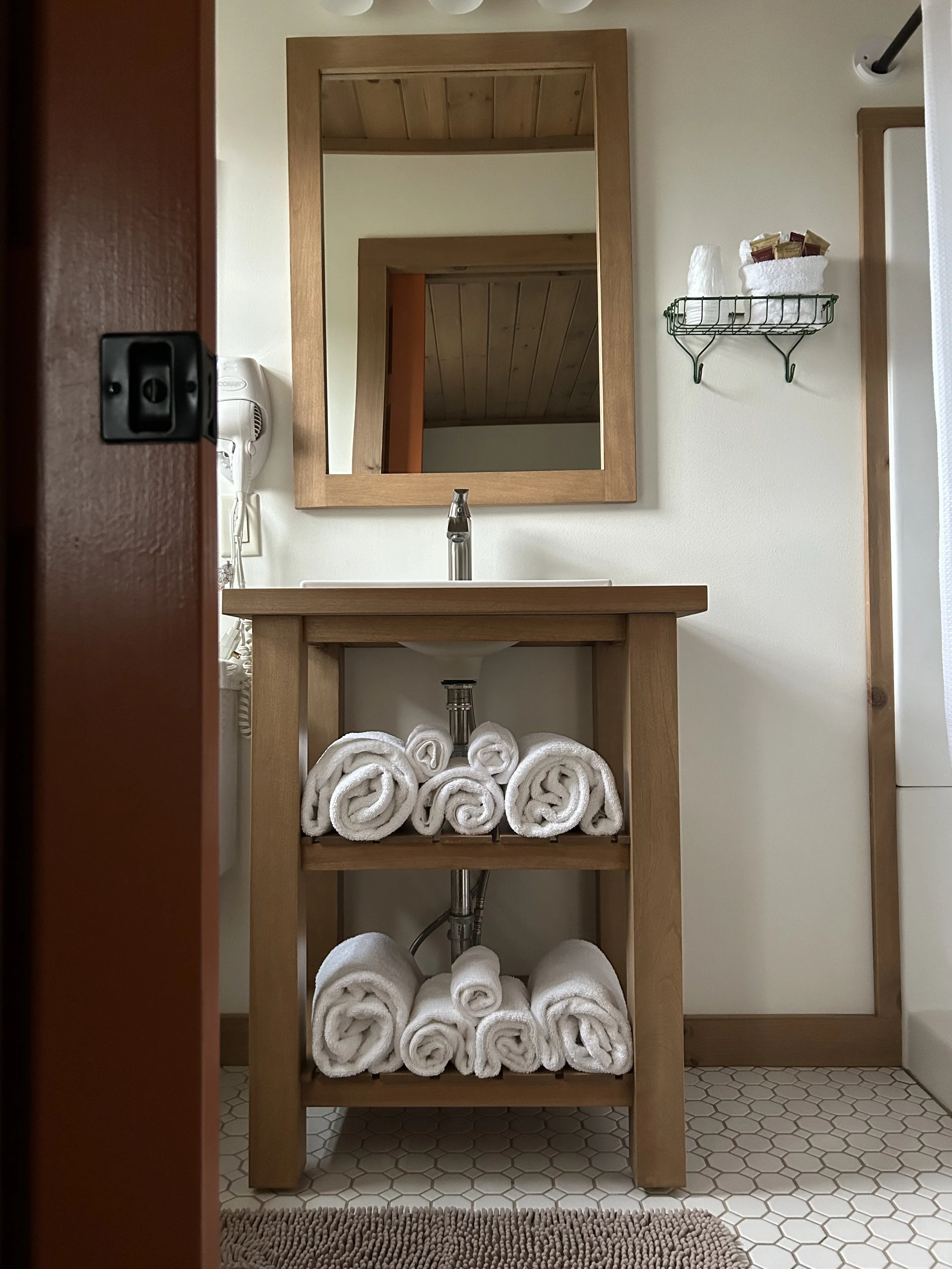 The rooms are moderately priced, but don’t let the rates fool you- the rooms are clean and simple. My room featured a little locker area to conveniently lay out cycling equipment. The beds were simple and the television small, though having the tv on is low on the priority list. I did manage to get sucked into watching the finale to Tombstone on the local cable channel, though. There is a minifridge. There is a pocket door to the bathroom, another simply themed room. There was one other chair but no table. Cadence Lodge has a community feel to it that ushers guests outside to admire the views.