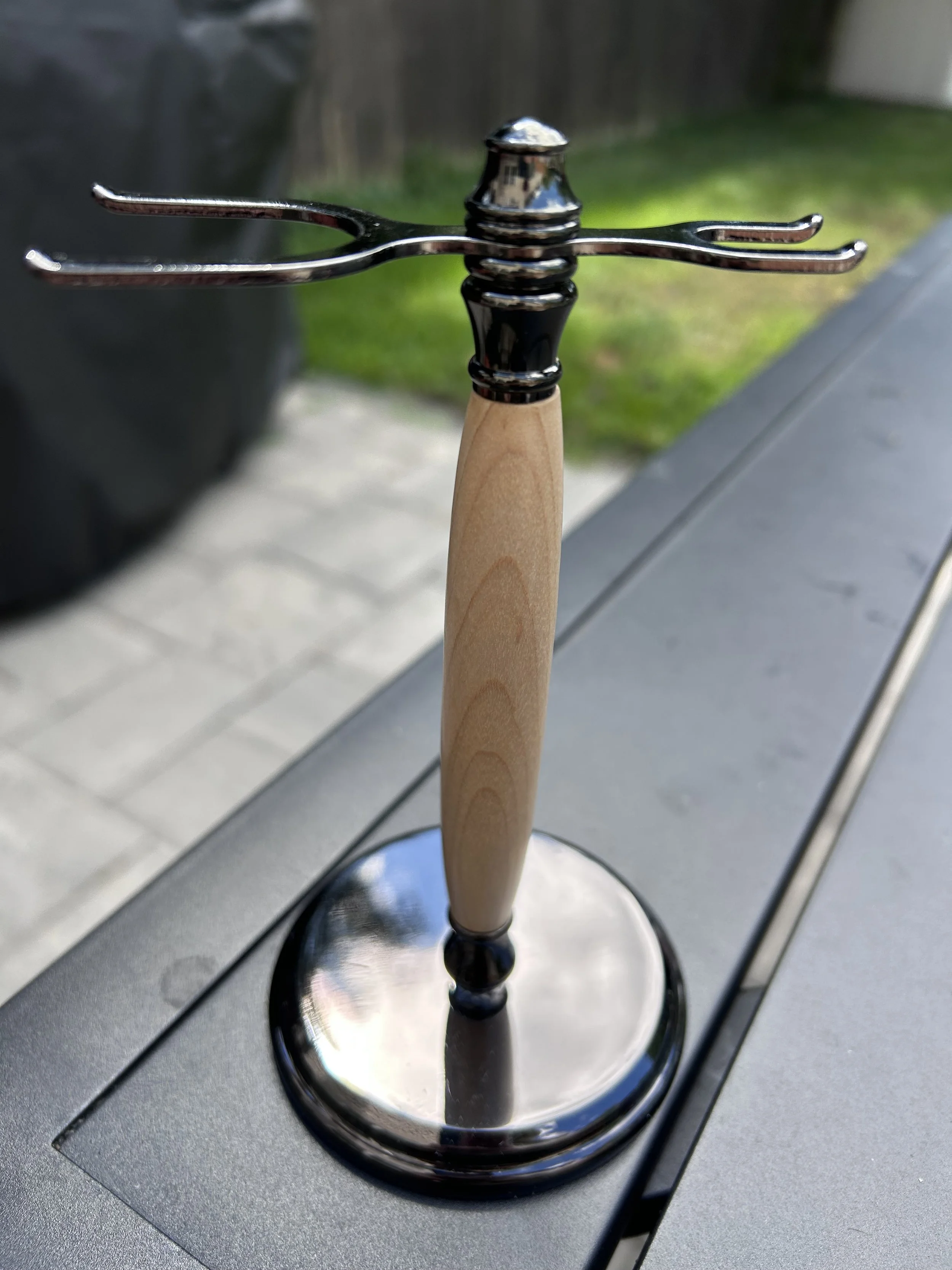 The stand should be ordered with scrutiny. An inquisition into whether a shavette or straight razor could lean safely in the double edge razor prong was a hard no. There were attempts on all three shave brushes to explore compatibility. Only one shave brush’s handle fit. No worries, the same issue plagued the last stand. Perhaps the builder could offer wider-gauged prongs to allow thicker brushes to be accommodated.